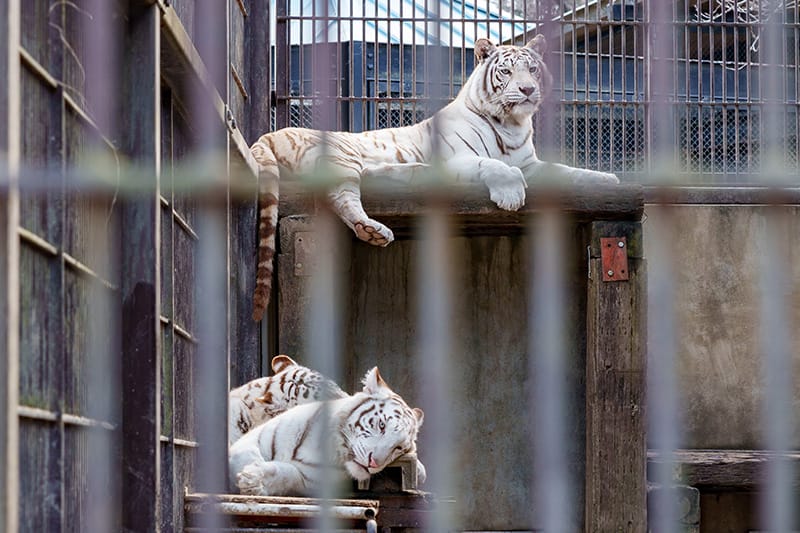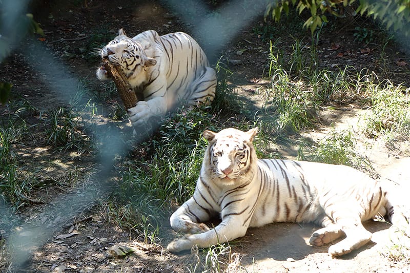 メイン猛獣舎では、仲の良い双子のホワイトタイガーが飼育されており、見学することができます。