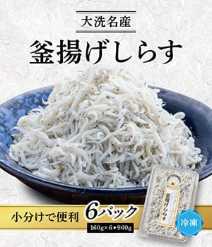 大洗の冷凍しらす大洗は有数のしらす産地で、大洗漁港の水揚の大半をしらすが占めています。しらすとは、カタクチイワシやマイワシの稚魚で、4月から7月までを春しらす、8月から11月までを秋しらすと呼びます。「釜揚げしらす」や「しらす干し」など、加工された状態で店頭に並んでいます。