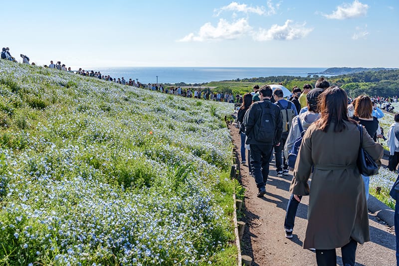 ネモフィラの見頃を迎えるGW中は、とくに激しい渋滞が発生します。開園前から渋滞は発生しますので、入り口から遠くとも駐車しやすい臨時駐車場を目指す方が賢い選択です。(帰りの際も結果的に楽です)