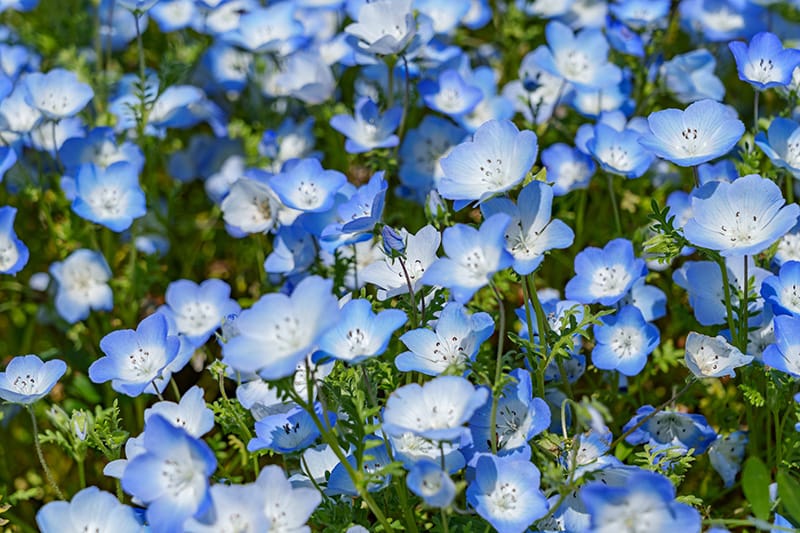 ネモフィラ属に分類される植物の総称で、和名「ルリカラクサ」とも呼ばれます。花名である「ネモフィラ」とは、ギリシャ語で「森を愛する」という意味があり、原種が森の周辺に自生することに由来します。また、花言葉は「どこでも成功・華麗なる成功・可憐・愛国心・清々しい心・荘厳・私はあなたを許す」とされています。花期は4〜5月頃に見頃をむかえ、高さは20〜25cmほど葉は長楕円形で対生し羽状に分裂しています。